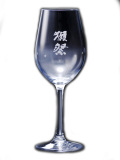 獺祭のロゴがプリントされた日本酒用グラス。元々、蔵でテイスティングに使っていたボルドータイプの