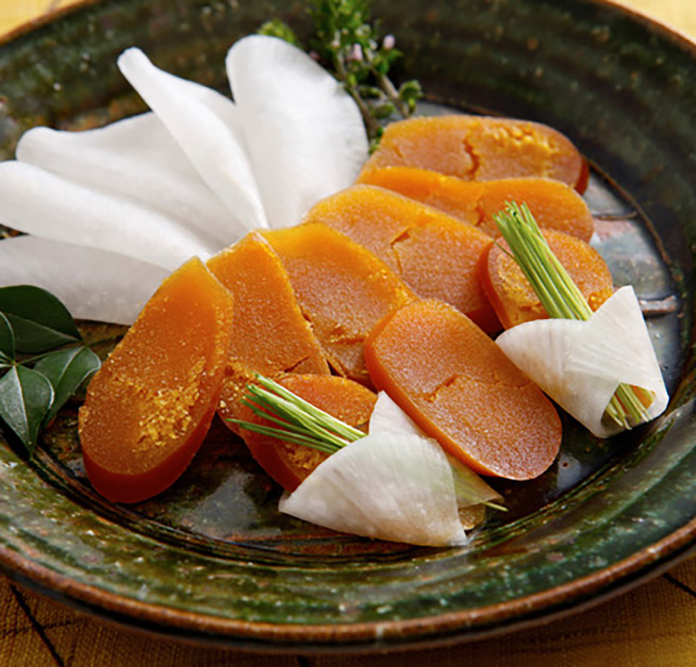 鶏卵、タラの卵、サメの卵のブレンドで見事にからすみの風味を再現しています。