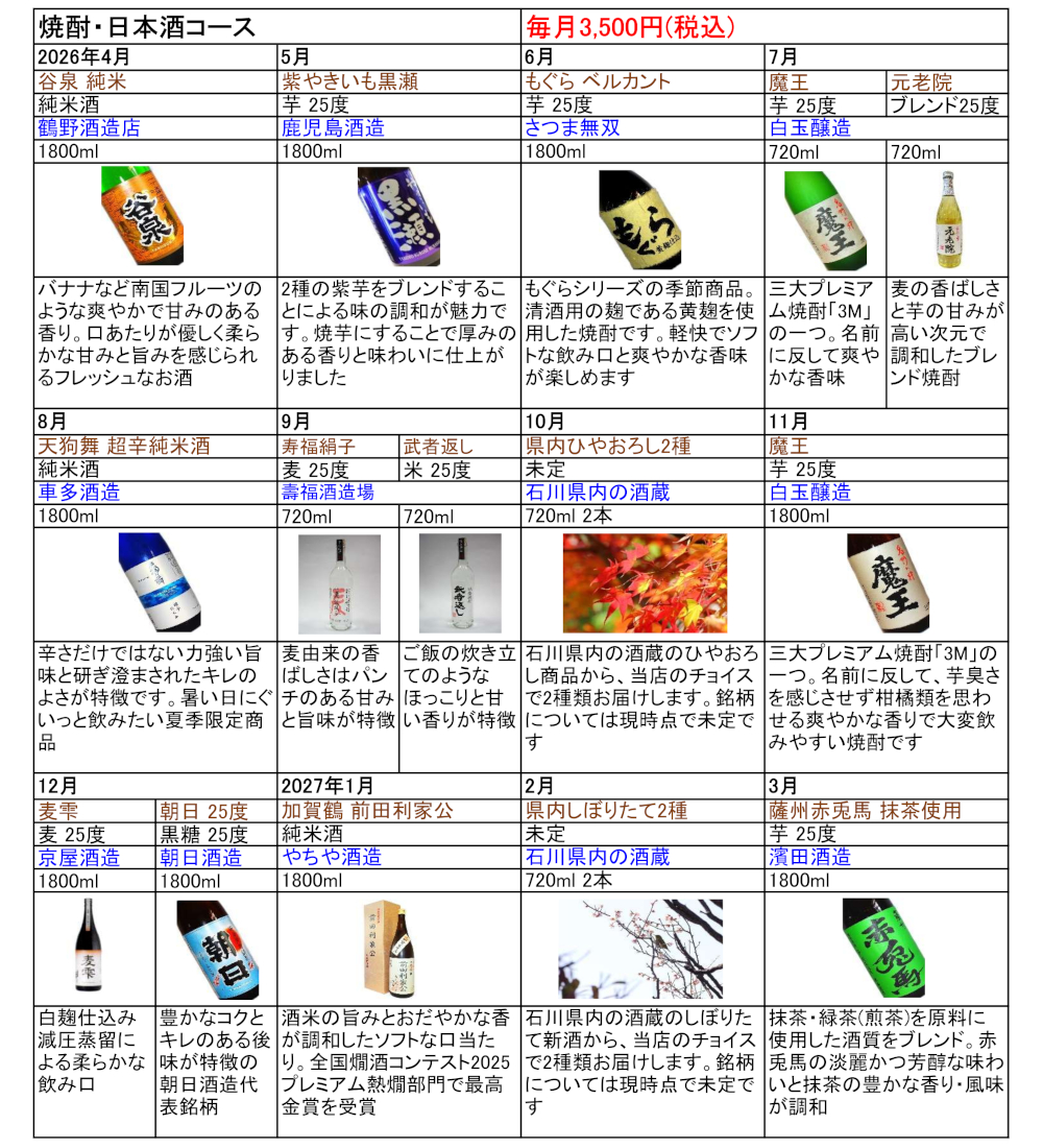「焼酎・日本酒コース」今年度の頒布予定商品は下記の通りです。
